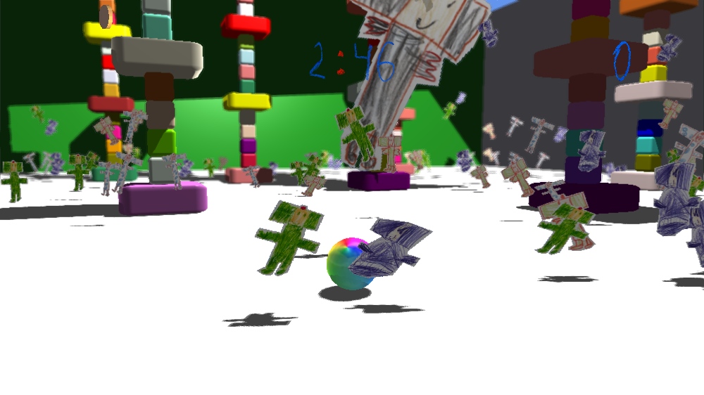 Rainbow Ball is a joy to play, and probably the main reason for that is the sound design. Much like in Katamari Damacy, every item you roll up makes a unique sound. For example, my favorite level is full of princesses drawn by the kids, dancing around the level — and also a little boy prince here or there. Each princess lets out a high, girlish scream, presumably produced by Smith’s daughters. Since there are scores of princesses dancing around at a very high density, you can hardly roll your ball without generating a cacophony reminiscent of an overstimulated boy band audience. But every so often you roll up a prince, and you hear a little “BLECH!” noise underneath it all, provided by a little boy whose definition of princehood is a negative one: a prince must simply to act in opposition to his princess sisters. It’s moments like these that make me laugh, but also make me remember what it was like to be a little boy, growing up with a younger sister.