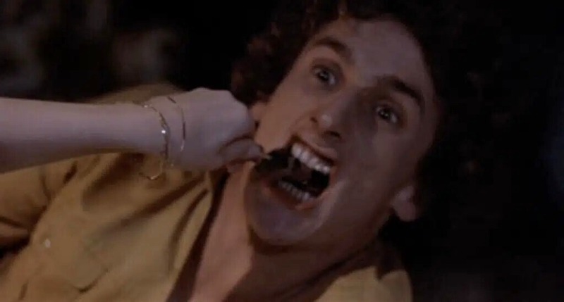 Happy Birthday to Me is one of the wackiest slashers of the 1980s (particularly that reveal in the third act, oh boy!). With director J. Lee Thompson at the helm, the film packs punches with many of its death scenes, but there’s one I think about particularly often. Ginny (Melissa Sue Anderson) believes she’s killing her classmates during her frequent blackouts, leading up to her birthday party. When she invites Steve (Matt Craven) over for wine and weed, Ginny begins feeding a sizzling hot shish kebab to him, only to turn violent and suddenly force the skewer down his throat. It’s so unexpected that it’ll make your head spin!