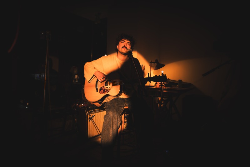 I lost ten more minutes to the Uber Bermuda Triangle—the map swore my car was “here,” reality swore otherwise; I should’ve just taken the damn bus again—then finally snagged a ride back to Sala Rossa and slipped in just in time to catch the tail of Pompey’s set. Noel was on drums this time, still grinning warmly, trading looks with Thanya Iyer (still on violin!) between fills like the two of them were keeping a secret the rest of us would only get in pieces. Pompey worked the room with that endearing, self-effacing patter: “Who’s here pretending they’re not tired? That’s how life works, isn’t it?” He introduced one number as “I’m Just a Little Baby,” then lined up the closer: “We have just one song left. It’s called ‘I’m Scared’—that’s the name of the album and also my favorite feeling. Do we ever do anything not because we’re scared? Is anyone not scared right now?” A few brave “woo”s. “Oh, so some of you think you’re better than me.” The room cracked up. The songs themselves were decidedly less funny, all filled with soft-spoken, cracked-voice confessions that landed in the gut, all the more raw for how simple they were: “I’ll be hoping that I don’t die ’til the day I die.” As I wrote in my Notes app while darting out the door: “he’s a little like a cross between Daniel Johnston and Jeffrey Lewis and also like a Hobo Johnson that isn’t insufferable/an affront to music,” which I did mean as a compliment (to Pompey, not to Hobo Johnson).